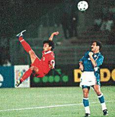 Aksi salto Widodo yang membuahkan gol terbaik Piala Asia 1996. Foto: twitter.com